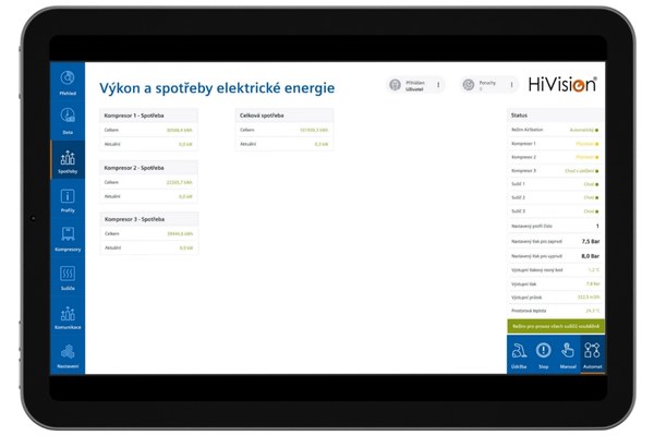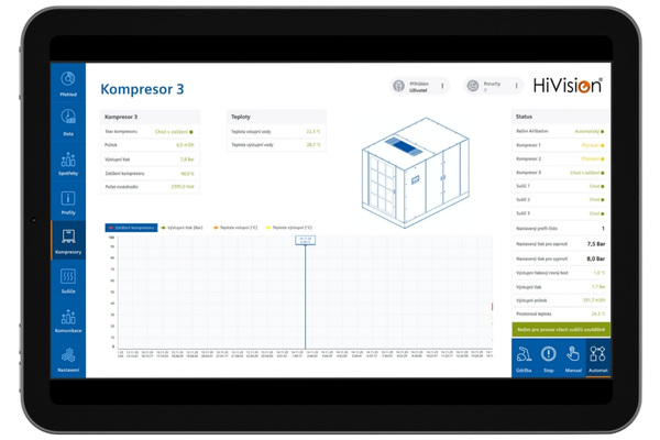 Modul HiVisionAir® umožňuje nepretržite online sledovať prevádzkové dáta aj produktivitu chodu kompresorov. Monitoruje kľúčové parametre, vyhodnocuje ich vývoj v čase a vďaka inteligentnej analytike dokáže predikovať ich ďalší trend.