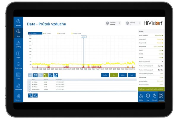 V praxi sa po nasadení HiVisionAir® často okamžite odhalí neefektívne správanie technológie. Vďaka optimalizácii nastavenia chodu jednotlivých kompresorov dochádza k zníženiu spotreby vstupnej energie – rýchlo, bezbolestne a s jasným finančným efektom. Systém je možné plne prispôsobiť špecifickým potrebám zákazníka, či už ide o spôsob vizualizácie, typy sledovaných dát alebo integráciu na ďalšie systémy. Na svoju prevádzku navyše nevyžaduje prístup do lokálnej IT siete – monitorovacia jednotka je vybavená GSM modulom, ktorý zabezpečuje bezpečnú dátovú konektivitu bez zásahu do infraštruktúry.